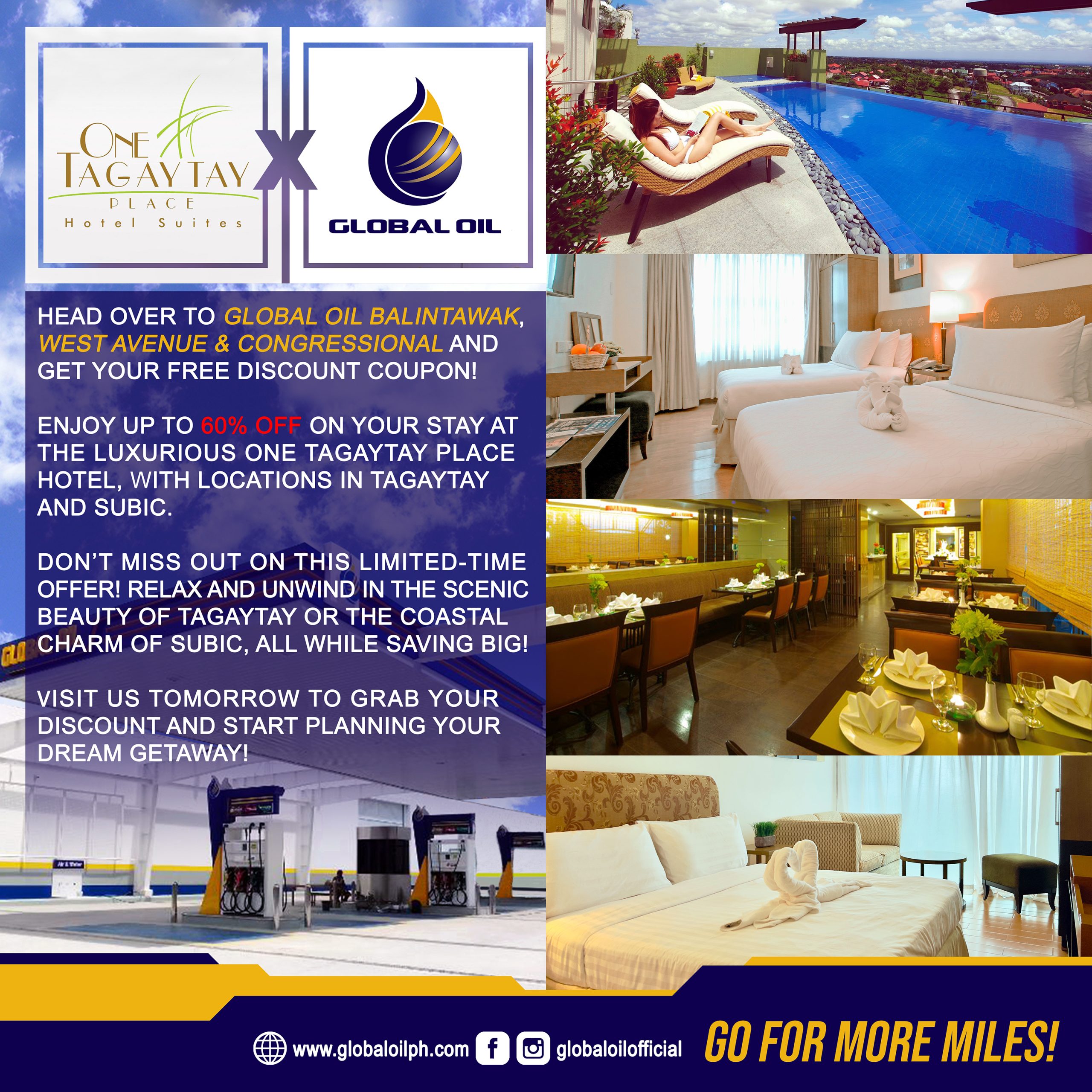 #GlobalOilExclusive #OneTagaytayPlaceHotel #TagaytayDeals #SubicGetaway #FuelYourAdventure #TravelWithDiscounts #GlobalOilPromos