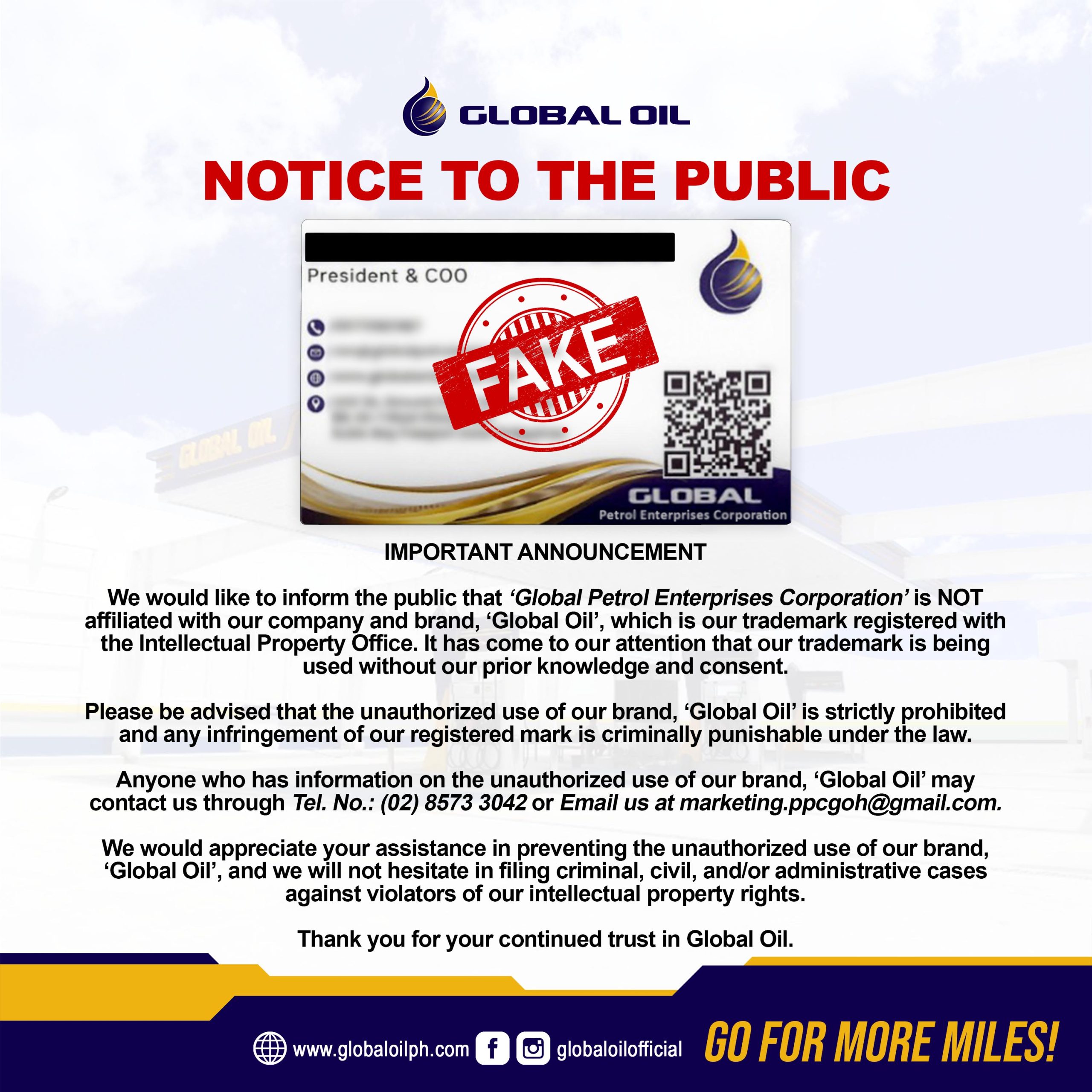 We would like to inform the public that 𝙂𝙡𝙤𝙗𝙖𝙡 𝙋𝙚𝙩𝙧𝙤𝙡 𝙀𝙣𝙩𝙚𝙧𝙥𝙧𝙞𝙨𝙚𝙨 𝘾𝙤𝙧𝙥𝙤𝙧𝙖𝙩𝙞𝙤𝙣 is 𝗡𝗢𝗧 affiliated with our company and brand, 𝗚𝗹𝗼𝗯𝗮𝗹 𝗢𝗶𝗹, which is our trademark registered with the Intellectual Property Office. It has come to our attention that our trademark is being used without our prior knowledge and consent.