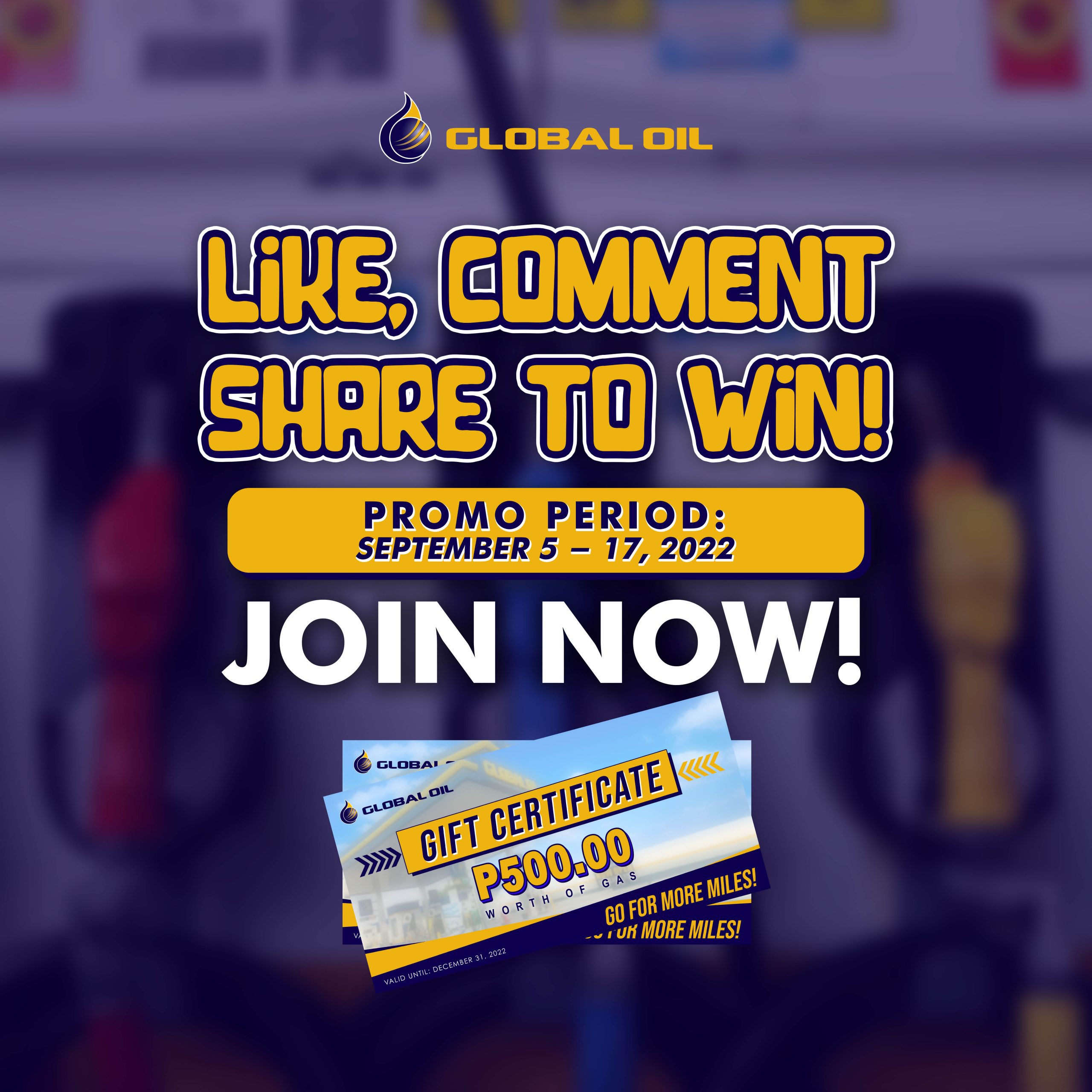 Starting today like our page, mention your friends and share our post and get a chance to win Php 500.00 gift certficate worth of gas from Global Oil.
