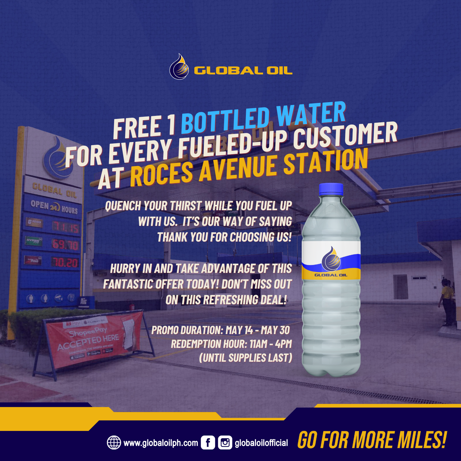 HELLO THERE! WE HAVE 1 FREE BOTTLED WATER FOR EVERY FUELED-UP CUSTOMER AT ROCES AVENUE STATION.