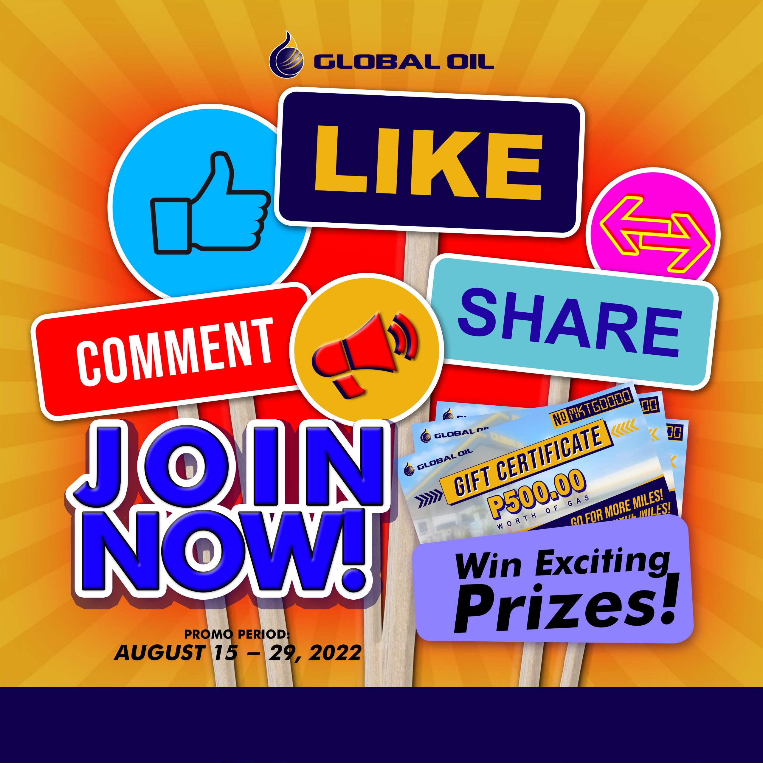 Starting on Monday, like our page, mention your friends and share our post and get a chance to win Php 500.00 gift certificate worth of gas from Global Oil.