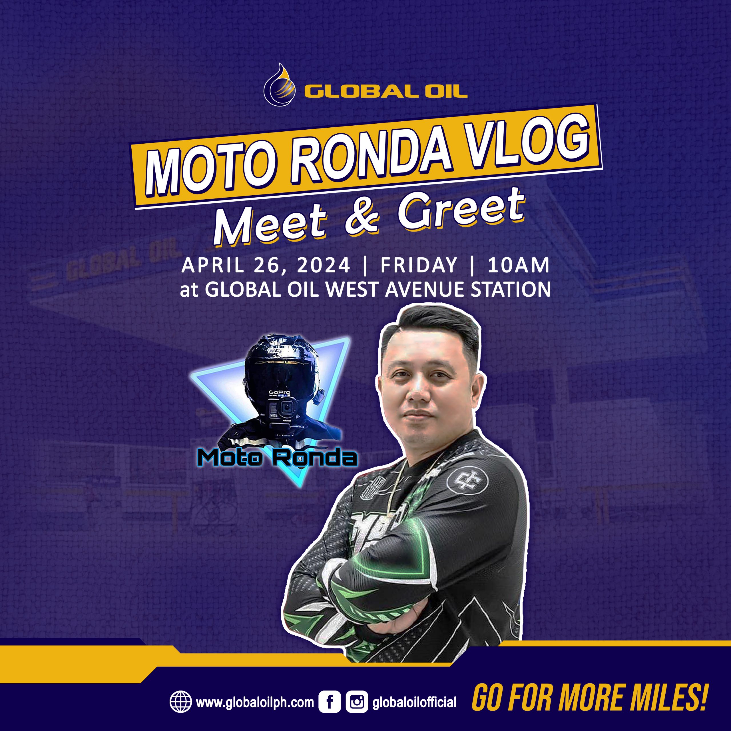 Hello everyone to all ka-Global Oil & Ka-ronda clear your calendars and get ready to meet and greet from MOTO RONDA VLOG on April 26, 2024 | Friday | 10am at Global Oil West Avenue Station. Maraming surpresa at pa-premyo na ipamimigay. ❤❤❤