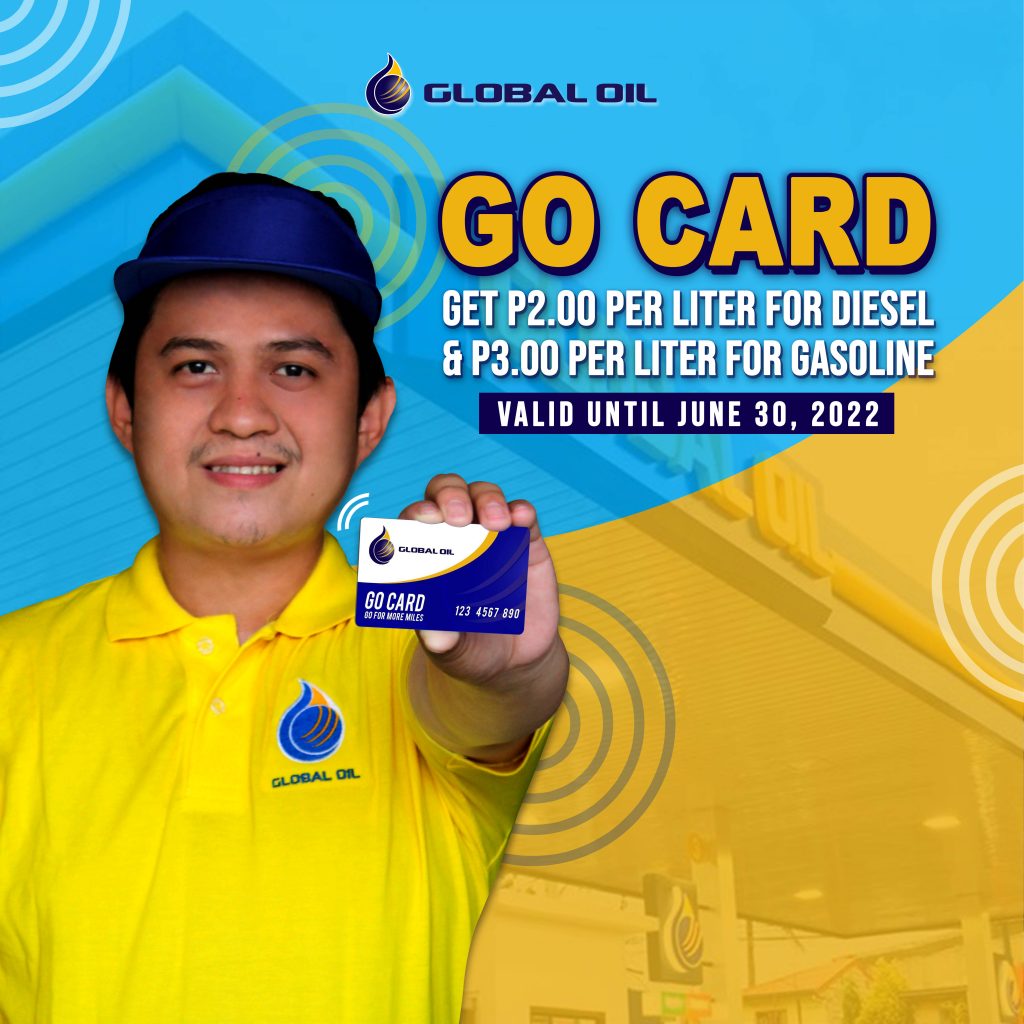 04 Jan News and Promos GO CARD PROMO September 14, 2022 By GOmarketingPPC_2023 Facebook Twitter GO Gas up now at Global Oil and get P2.00 per liter for Diesel and 3.00 per liter for Gasoline. P...Continue reading